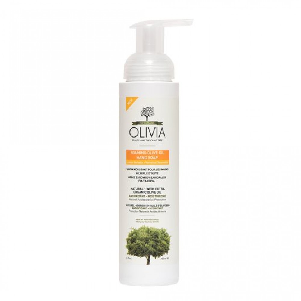 Olivia foam soap with verbena extract, made with a traditional recipe and out of 100% authentic Greek olive oil, is enriched with unique extracts of olive fruits and leaves from Papoutsanis’ company organic olive groves in Evia. Its rich foam cleanses gently and treats skin with extra care, offering antioxidant and anti-aging protection. Enriched with tea tree oil, it gives a natural antibacterial protection while its verbena extract offers natural anti-inflammatory and softening qualities. With practical dispenser for ease of use and longer lasting than common soaps. It does not irritate. Ideal for the whole family and for all skin types.